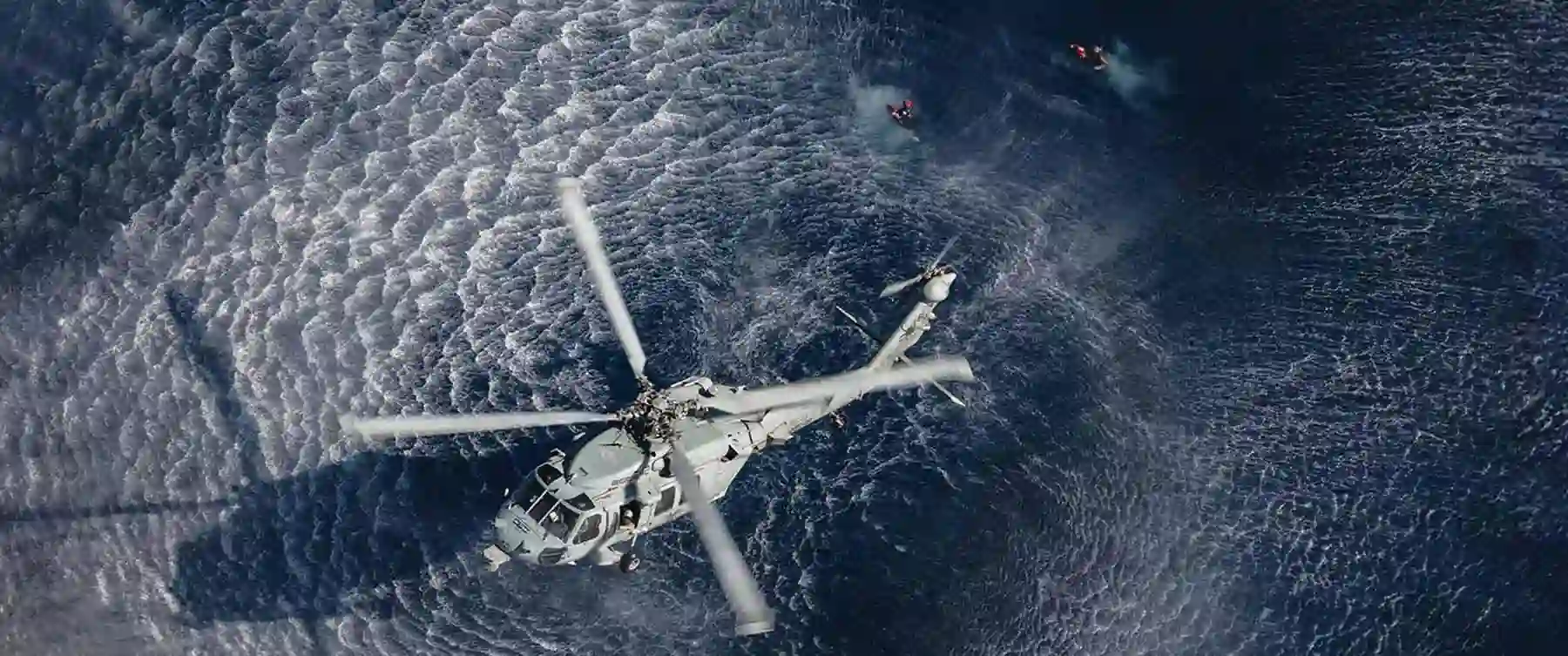 图:MH-60 直升机海军机组人员在大西洋海域进行搜救演习。