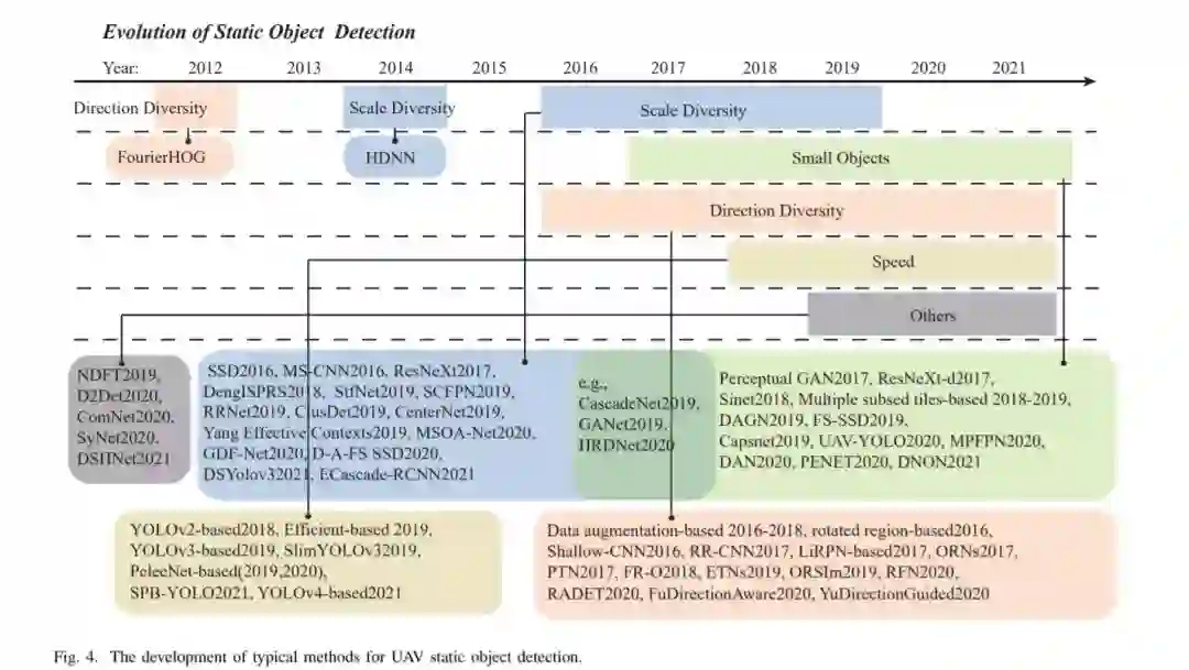本文以最大起飞重量小于30公斤的无人机为研究对象,通过总结最新发表的研究成果,对基于深度学习(DL)的无人机目标检测与跟踪方法进行了全面综述,讨论了关键问题和难点问题,并描述了未来的发展领域。本文的其余部分组织如下。第二节概述了无人机的统计情况和相关出版物。第六节介绍现有的基于无人机的遥感数据集。第三至第五节综述了三个分支在基于无人机的目标检测和跟踪方面的现有基于DL的工作。第八节讨论结论。