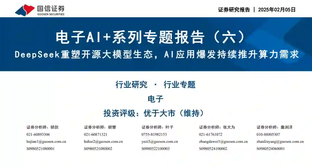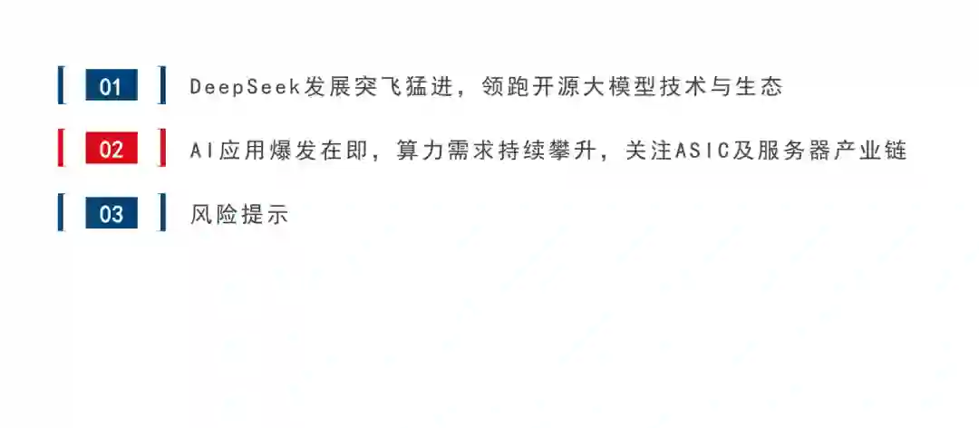 DeepSeek发展突飞猛进,领跑开源大模型技术与生态,DeepSeek模型已成为全球现象级模型。DeepSeek(深度求索)公司成立于2023年7月,是一家致力于实现通用人工智能(AGI)的创新型科技公司。2024年12月,DeepSeek-V3发布,性能对齐海外领军闭源模型。据官方技术论文披露,V3模型的总训练成本为557.6万美元,对比GPT-4o等模型的训练成本约为1亿美元。2025年1月,DeepSeek-R1发布,性能对标OpenAI-o1正式版。在数学、代码、自然语言推理等任务上,性能比肩OpenAI-o1正式版。2月1日消息,据彭博社报道,DeepSeek的人工智能助手在140个市场下载次数最多的移动应用程序排行榜上名列前茅。国外大型科技公司如微软、英伟达、亚马逊等已先后上线部署支持用户访问DeepSeek-R1模型。2月1日,华为云官方发布消息,硅基流动和华为云团队联合首发并上线基于华为云昇腾云服务的DeepSeekR1/V3推理服务。 DeepSeek通过MLA和DeepSeekMoE实现高效的推理和低成本训练,构建DualPipe算法和混合精度训练优化计算与通信负载;通过(分阶段)强化学习实现性能突破。多头潜在注意力(MLA)通过低秩联合压缩技术,大幅削减了注意力键(keys)和值(values)的存储空间,显著降低了内存需求。DeepSeekMoE架构采用了更为精细粒度的专家设置,能够更加灵活且高效地调配资源,进一步提升了整体的运行效率和表现。DeepSeek模型对跨节点的全对全通信机制进行优化,充分利用InfiniBand和NVLink提供的高带宽。创新性提出了DualPipe算法,通过优化计算与通信的重叠,有效减少了流水线中的空闲时间。采用FP8混合精度训练技术,不仅极大地加快了训练速度,还大幅降低了GPU内存的消耗。DeepSeek-R1-Zero通过强化学习架构创新实现突破性性能,核心技术创新体现在训练效能优化策略、双维度评价体系、结构化训练范式三个维度。DeepSeek-R1采用分阶段强化学习架构演进,包括冷启动阶段、面向推理的强化学习、拒绝采样与监督式微调、全场景强化学习等。 AI应用爆发在即,算力需求持续攀升,关注ASIC及服务器产业链。ScalingLaw与“涌现”能力是大模型训练遵循的重要法则,随着ChatGPT引领全球AI浪潮,国内外科技公司纷纷发布AI大模型,截至24年7月,全球AI大模型数量约1328个(其中美国位居第一位,占比44%;中国位居第二位,占比36%),模型的迭代加速、竞争加剧。同时,AI模型向多模态全方位转变,AI应用百花齐放,企业主动拥抱AI应用市场。因此,模型数量、模型参数、数据总量的持续增长及AI应用需求推动全球算力爆发式增长。在英伟达GPU随着架构的不断演进及算力的成倍增长,于AI大模型训练中得到广泛运用的同时,为了满足CSP客户更高性能和更好功能的需求,定制化芯片ASIC的需求持续提升,牧本钟摆从标准化逐渐摆向定制化。与之相应的算力基础设施持续建设和升级,促使国内外云服务商资本开支持续高速增长,带来AI服务器市场规模大幅提升,预计到26年全球AI服务器出货量将达到237万台,对应2023-2026年CAGR为26%。