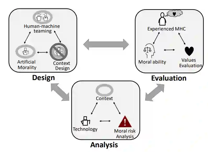 在前面的章节中,我们已经论证了多器官功能障碍是一种动态的复杂属性,它具有社会技术、道德和时间维度。因此,设计 MHC 也是一个复杂的过程,不能用简单的清单或瀑布式设计方法来体现。要在一个智能体团队中实现并保持 MHC,需要在系统的分析、设计和评估等迭代阶段进行仔细考虑。一些相关的考虑因素如下图所示。