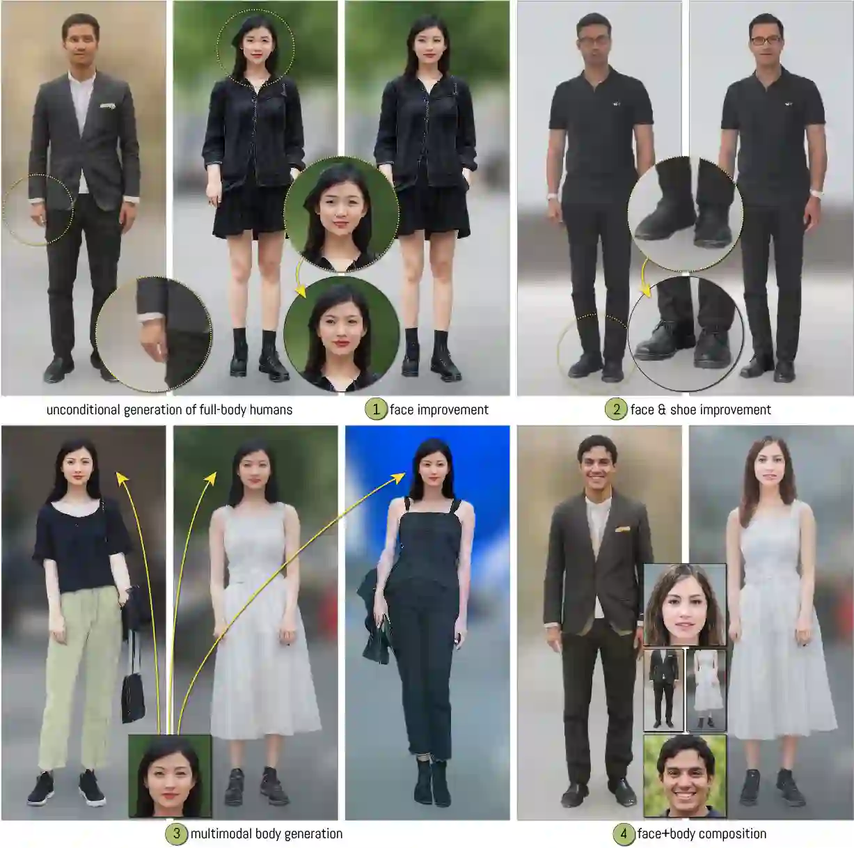 展示了几个 StyleGAN2 生成的全身人体示例的比较。我们专注于在我们生成的结果中经常出现不需要的伪影的区域。使用我们的 InsetGAN 方法,我们能够使用专用模型生成面部和鞋子,并为各自的组合生成适当的身体。结果在三个不同的生成器模型的输出之间产生了无缝转换。