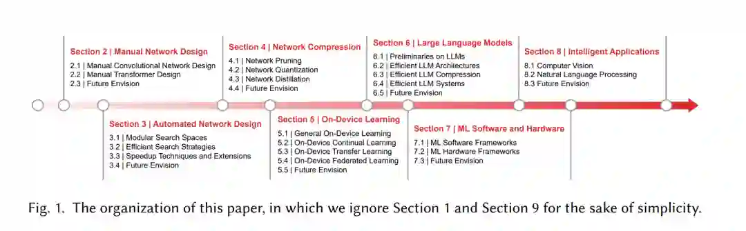 本文旨在总结近期的高效深度学习基础设施,这些基础设施有望为当前和未来的嵌入式计算系统提供支持,推动无处不在的嵌入式智能发展。实际上,一些现有的综述[71–74]通常聚焦于高效的深度学习算法,但由于深度学习基础设施,尤其是从大型语言模型的角度来看,正在迅速发展,这些综述可能已显得过时。与[71–74]不同,我们的重点是提供更全面和整体的视角,概述近期针对嵌入式计算系统的高效深度学习基础设施,涵盖从训练到推理、从手动到自动、从卷积神经网络到变换器(transformer)、从变换器到视觉变换器(vision transformer)、从视觉模型到大型语言模型、从软件到硬件、从算法到应用等多个方面。具体来说,我们从以下几个方面讨论了嵌入式计算系统的高效深度学习基础设施: