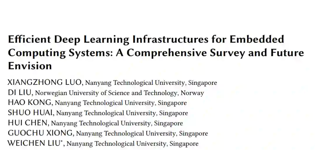 深度神经网络(DNNs)最近在一系列现实世界的视觉和语言处理任务中取得了令人瞩目的成功,涵盖了从图像分类到许多其他下游视觉任务,如物体检测、跟踪和分割。然而,尽管以前成熟的深度神经网络在保持优越准确性的同时,网络结构越来越深和宽,必然需要大量的计算资源进行训练和推理。这一趋势进一步扩大了计算密集型深度神经网络与资源受限的嵌入式计算系统之间的计算差距,使得在现实世界的嵌入式计算系统上部署强大的深度神经网络以实现无处不在的嵌入式智能变得更加具有挑战性。为了缓解上述计算差距并促进无处不在的嵌入式智能,本文综述重点讨论了近期针对嵌入式计算系统的高效深度学习基础设施,涵盖从训练到推理、从手动到自动、从卷积神经网络到变换器(transformer)、从变换器到视觉变换器(vision transformer)、从视觉模型到大规模语言模型、从软件到硬件、从算法到应用等多个方面。具体来说,我们从以下几个角度讨论了嵌入式计算系统的高效深度学习基础设施: