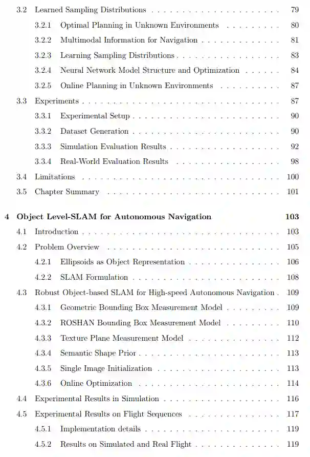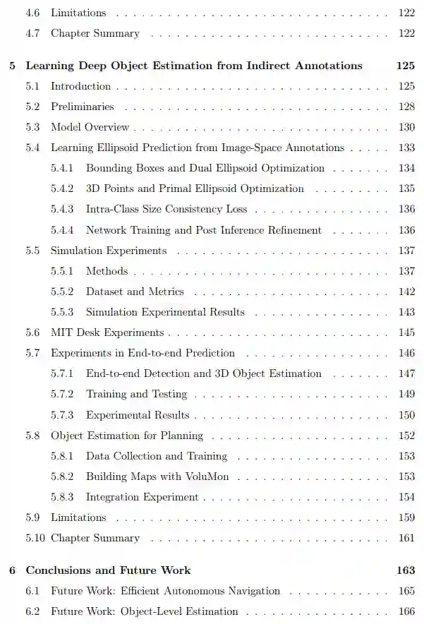 在这篇论文中,我们提出了在新环境中改善自主导航的三个贡献。首先,我们通过将有用的导航行为编码在由部分占有率和对象级地图告知的抽样分布中,来提高新环境中的导航效率。我们认识到,在有效导航时,在有限的视角下,对象层面的估计是具有挑战性的,因此我们还开发了两种在线建立对象层面表征的方法。在我们的第二个贡献中,我们通过引入额外的纹理测量和语义类形状先验,提高了带有椭圆体表征的对象级SLAM的视点效率。最后,在我们的第三个贡献中,我们提出了一种新的深度学习的三维对象估计方法,利用间接的图像空间注释和类内形状一致性来实现从单一的RGB图像的三维对象估计。