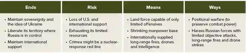本文通过使用 ends-ways-means-risk 启发式方法来解决这些问题。在此过程中,它考察了俄罗斯和乌克兰目前的战略部署,而不是它们在 2022 年 2 月的样子,也不是可能希望它们成为的样子。从偏好和愿望的角度来看待冲突会导致任何分析家误读战略形势。然而,本文的目的是清醒地审视冲突的现实,对局势进行评估,并假设冲突在 2024 年可能走向何方。