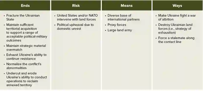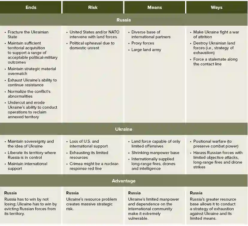 俄乌战争目前处于停滞状态。这种僵局是相互竞争的战略的结果,其中一种战略侧重于保留被吞并的领土,另一种战略侧重于将敌对势力从其领土上消灭,而没有办法实现这一目标。考虑到与每个国家目的相关的平衡,俄罗斯目前正在赢得战争(见表 3)。俄罗斯控制着乌克兰领土的大部分地区,除了乌克兰目前无法承受的残酷陆战之外,他们不太可能通过任何其他方式被驱逐出该领土。更重要的是,乌克兰是否能够产生解放和守住顿巴斯所需的力量是值得商榷的,顿巴斯是通往克里米亚和克里米亚的陆桥。可能需要一个国际联盟来产生完成乌克兰被占领土解放所需的部队、作战部队和打击能力。这种国际联盟的实现极不可能发生。