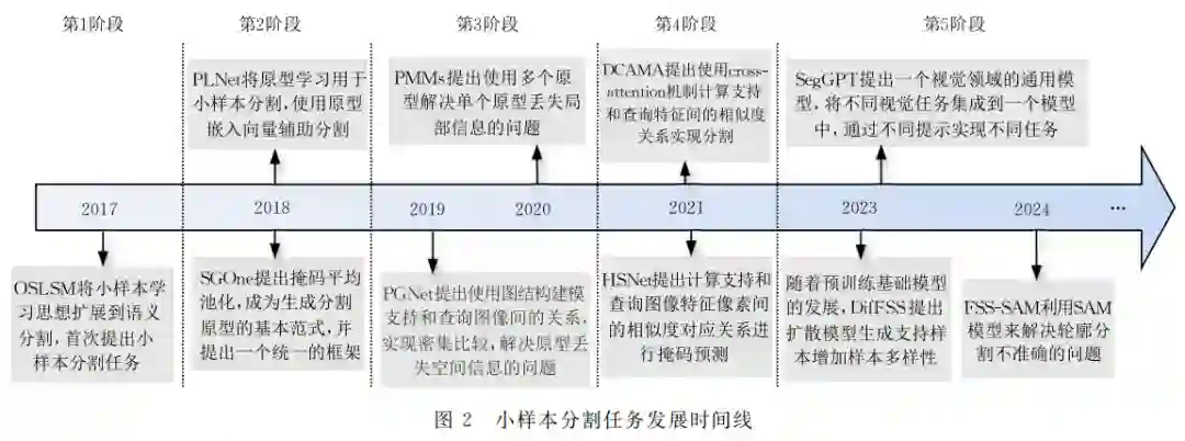 传统语义分割任务通常是数据驱动的,需要大规模密集标注样本训练,并且不能泛化到新类,因此在实际 应用中受到很大限制.为了缓解传统语义分割中数据匮乏和泛化能力差的问题,人们提出小样本语义分割任务,在 未见类别仅提供少量密集标注样本的情况下实现新类分割,在医疗图像分割、自动驾驶等应用领域扮演着重要的 角色,已成为计算机视觉领域的重要研究方向之一.本文从基础知识、模型算法和拓展应用等方面对自然图像领域 的小样本语义分割研究展开调查,具体包含以下内容:(1)介绍了小样本语义分割的背景知识,包括它的由来、核心 思想、概念知识、存在挑战、数据集和性能评价指标;(2)详细分析和比较当前小样本语义分割算法,根据推理过程 中是否存在梯度回传将其分为基于优化和基于度量学习的方法,并归纳了其发展现状和不同算法的优缺点;(3)介 绍了小样本语义分割与其他技术融合的任务,包括小样本实例分割、广义小样本分割、增量小样本分割、弱监督小 样本分割及跨域小样本分割;(4)讨论了小样本语义分割任务仍存在的问题和未来展望。