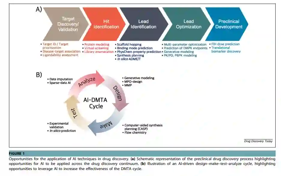 人工智能(AI)正在成为药物发现的重要组成部分。它具有跨越药物发现和开发价值链的潜力,从目标识别到临床开发。这篇综述,我们提供了当前人工智能技术的概述,并通过突出人工智能对临床前药物发现产生实际影响的例子,对人工智能如何重塑临床前药物发现进行了综述。通过对人工智能在药物发现过程中所带来的基于,我们希望通过讨论人工智能在药物发现过程中所带来的机遇和挑战来提出一个现实的观点。