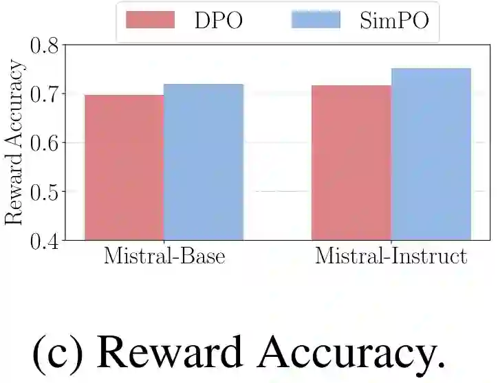 图 4c 比较了 SimPO 和 DPO 的奖励准确度,这评估的是它们最终学习到的奖励与留存集上的偏好标签的对齐程度。可以观察到,SimPO 的奖励准确度高于 DPO,这说明 SimPO 的奖励设计有助于实现更有效的泛化和更高质量的生成。