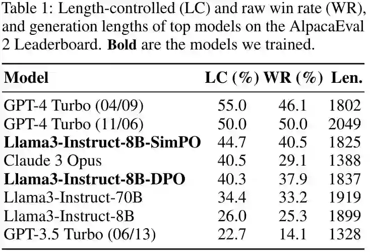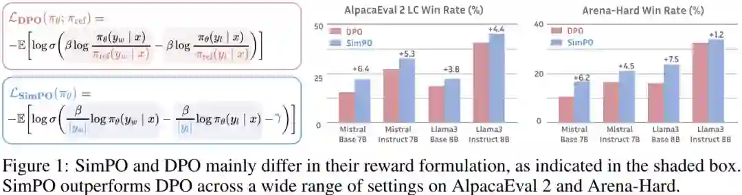 使用 DPO 时,得到隐式奖励的方式是使用当前策略模型和监督式微调(SFT)模型之间的响应似然比的对数 的对数比。但是,这种构建奖励的方式并未与引导生成的指标直接对齐,该指标大约是策略模型所生成响应的平均对数似然。训练和推理之间的这种差异可能导致性能不佳。