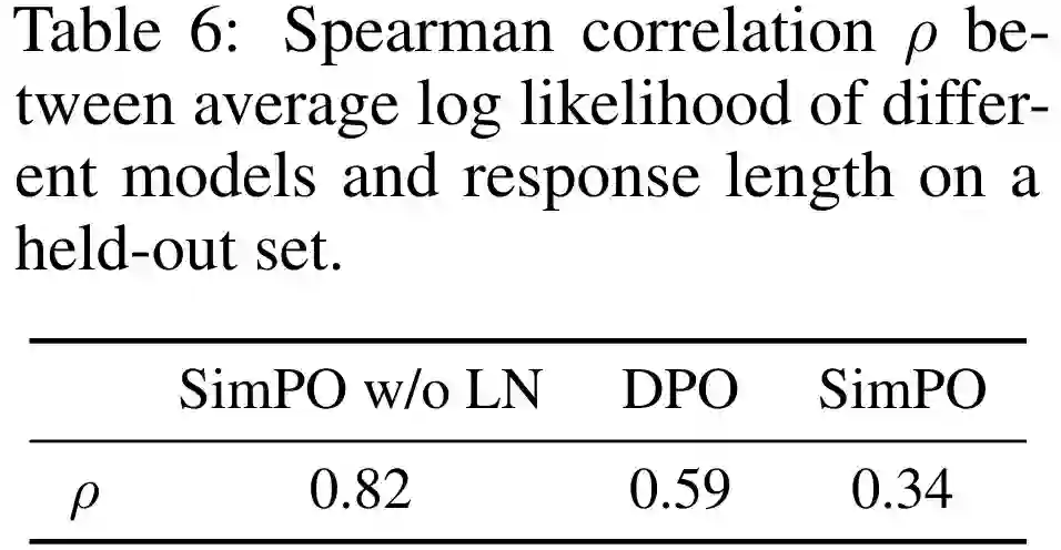 尽管 DPO 奖励表达式 (不包含配分函数)缺乏一个用于长度归一化的显式项,但策略模型和参考模型之间的对数比可以隐式地抵消长度偏见。如表 6 与图 4a 所示,相比于没有任何长度归一化的方法(记为 SimPO w/o LN),使用 DPO 会降低平均对数似然和响应长度之间的斯皮尔曼相关系数。但是,当与 SimPO 比较时,其仍然表现出更强的正相关性。