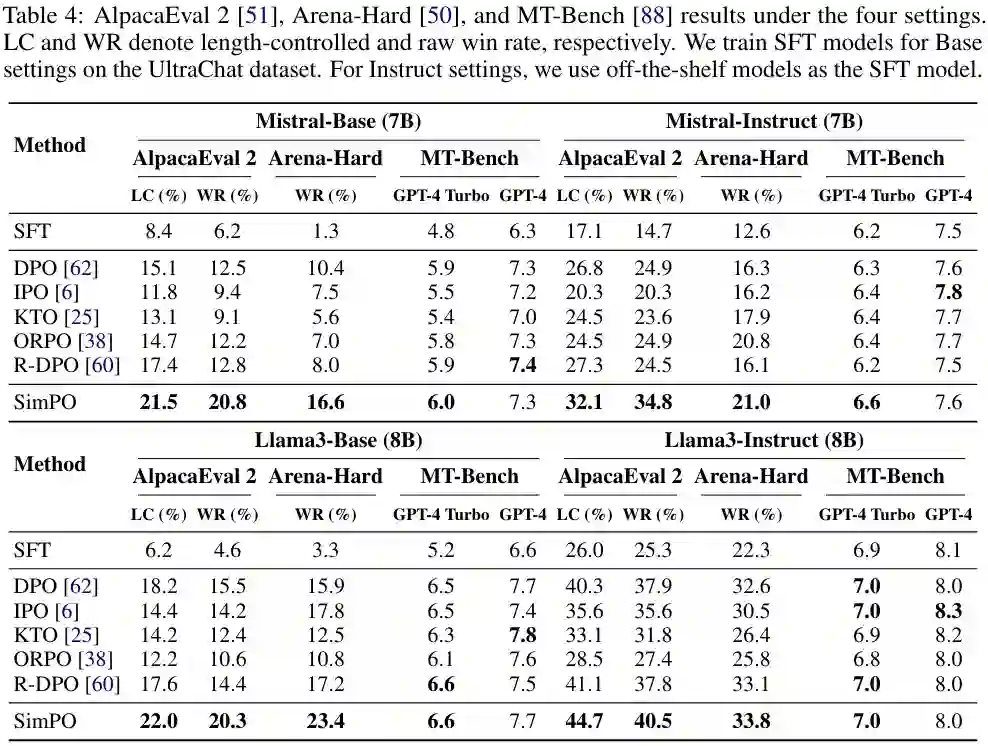 SimPO 的表现总是显著优于之前已有的偏好优化方法。如表 4 所示,尽管所有的偏好优化算法的表现都优于 SFT 模型,但简单的 SimPO 却在所有基准和设置上都取得了最佳表现。这样全面的大幅领先彰显了 SimPO 的稳健性和有效性。
