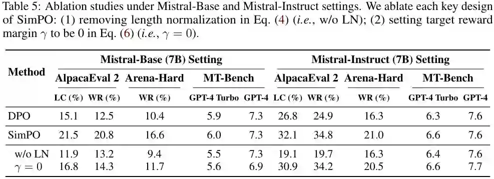 SimPO 的两种关键设计都很重要。表 5 展示了对 SimPO 的每种关键设计进行消融实验的结果。(1) 移除 (4) 式中的长度归一化(即 w/o LN);(2) 将 (6) 式中的目标奖励差额设置为 0(即 γ = 0)。