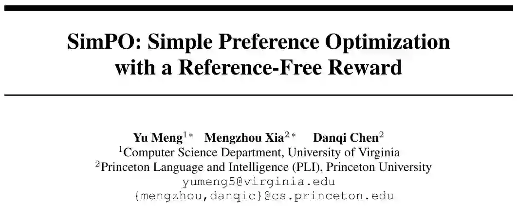 论文标题:SimPO: Simple Preference Optimization with a Reference-Free Reward * 论文地址:https://arxiv.org/pdf/2405.14734 * 代码 & 模型:https://github.com/princeton-nlp/SimPO