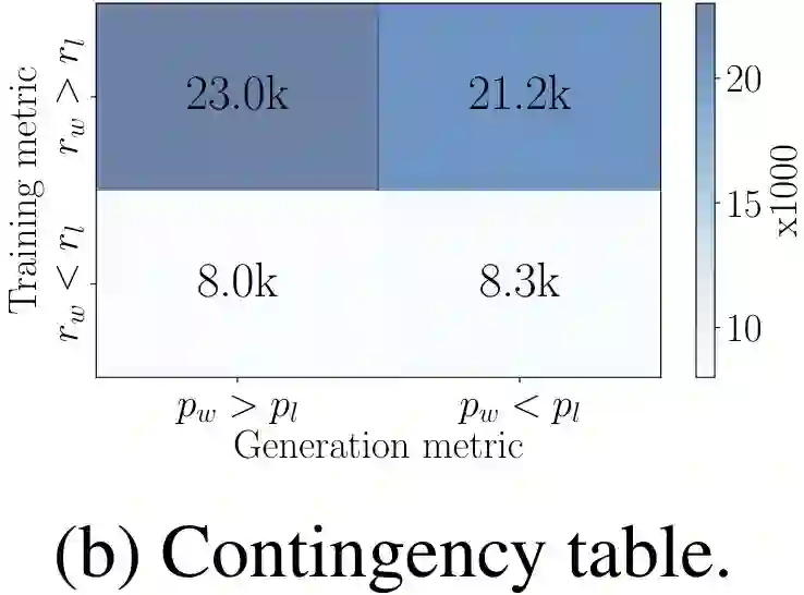 DPO 的奖励与平均对数似然指标之间存在差异,这会直接影响生成。如图 4b 所示,在 UltraFeedback 训练集上的实例中,其中 ,几乎一半的数据对都有