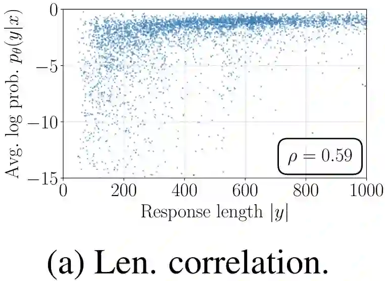 构建在长度上归一化的奖励。很自然地,我们会考虑使用 (3) 式中的 p_θ 来替换 DPO 中的奖励构建,使其与引导生成的似然指标对齐。这会得到一个在长度上归一化的奖励: