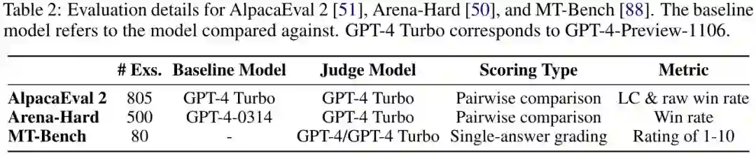 评估基准。该团队使用了三个最常用的开放式指令遵从基准:MT-Bench、AlpacaEval 2 和 Arena-Hard v0.1。这些基准可评估模型在各种查询上的多样化对话能力,并已被社区广泛采用。表 2 给出了一些细节。