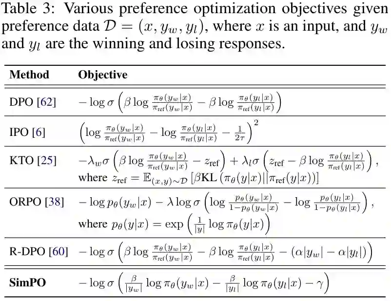 基线方法。表 3 列出了与 SimPO 做对比的其它离线偏好优化方法。