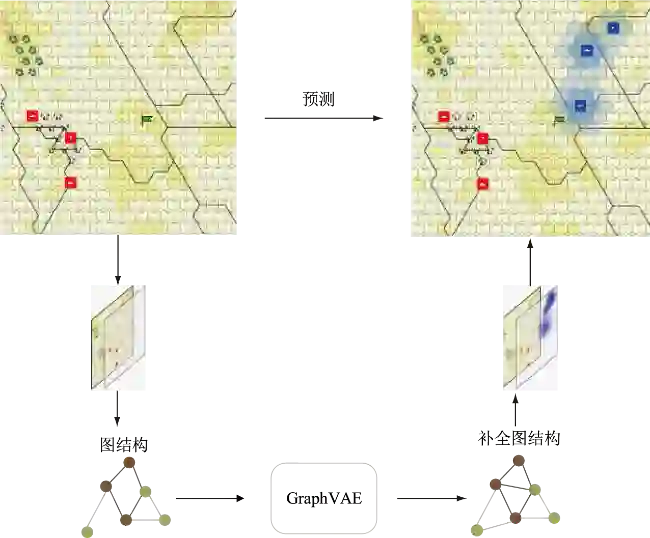图1 主要工作框架 因此,本文的主要工作包括: 1)对兵棋推演中的态势数据进行预处理,在预处理的基础上,将态势图转化成图结构数据,算子作为图中的节点,算子之间的关联关系作为图中的边属性。 2)把图结构数据应用到图神经网络GraphVAE模型上进行数据信息的补全,重建并生成补全算子关系信息后的图。 3)根据补全后的图结构,预测出敌方算子在地图上的位置坐标范围。