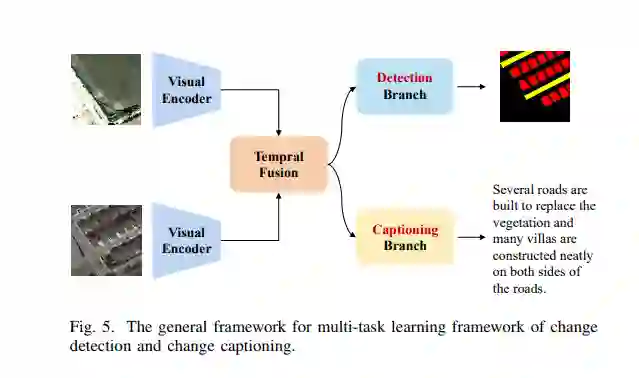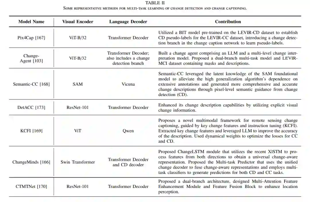 在遥感时序图像分析中,变化检测和变化描述任务侧重于不同层次的变化信息提取【103】【166】。变化检测主要关注生成像素级的变化掩膜,通过双时相图像识别和突出变化区域。相比之下,变化描述则旨在对这些变化进行语义层次的理解,包括对象属性和上下文关系。鉴于这两个任务之间的内在联系,近期的研究将变化检测和变化描述整合为统一的多任务学习框架,以提高变化解译的整体效率和准确性。表II总结了一些代表性的方法。Change-Agent【103】是该领域的代表性工作之一,建立了一个多任务学习框架,为后续的研究奠定了基础【166】–【170】。如图5所示,该框架基于共享的视觉编码器,分别为变化检测和变化描述任务采用两个任务特定的分支。在视觉编码阶段,模型从双时相图像中提取时序特征,这些融合的特征为每个任务的后续分支提供支持。值得注意的是,与传统的变化检测模型类似,变化检测分支通常利用视觉编码器提取的多尺度双时相特征,以确保变化掩膜的精确性和细节。与此同时,变化描述分支通常仅利用最深层的视觉特征,关注变化的语义,设计上与单任务变化描述模型相似。在多任务框架中平衡两项任务的训练是一项关键挑战。当前的研究通常应用加权损失,通过不同的权重将变化检测和变化描述的损失结合起来。例如,文献【166】采用了通过调整辅助任务梯度大小的元平衡策略【171】,而【169】和【170】则采用了动态权重平均策略【172】。此外,一些近期研究探索了变化检测如何专门帮助变化描述提高描述的准确性【163】【173】。核心思想是,像素级的变化检测能够增强变化描述模型识别变化的能力,特别是在低光照条件下或针对小结构的变化。例如,MV-CC【163】使用低分辨率的变化检测掩膜作为显式指导,帮助模型准确关注变化区域。 C. 遥感变化视觉问答