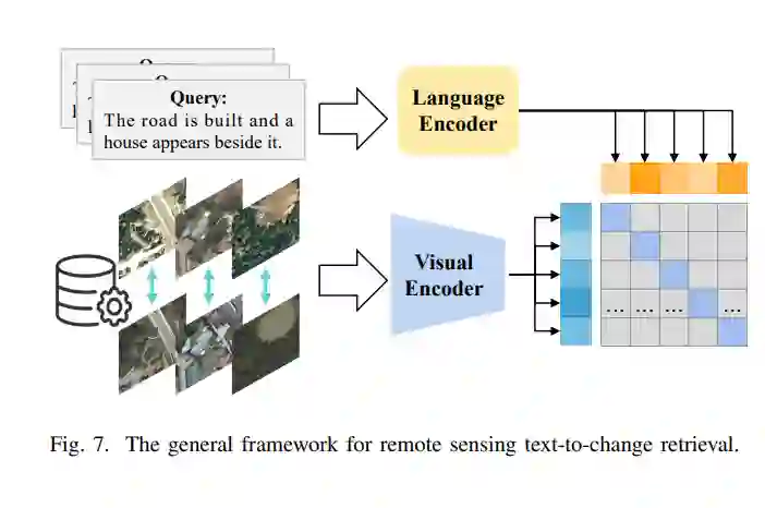 随着遥感图像数据的快速增长,如何高效地检索符合特定用户需求的图像,已成为环境监测、灾害评估和城市规划等领域的关键问题。传统的基于文本的图像检索技术将用户提供的查询文本与单时相图像进行匹配。然而,这种技术忽略了遥感图像中的时间变化,难以满足用户对动态场景的检索需求。 遥感文本到变化检索(RSI-TCR)应运而生,以解决这一限制。其核心目标是高效检索符合用户输入查询描述的图像变化的双时相图像对。RSI-TCR显著减少了筛选大规模数据集所需的人工工作量,提高了庞大遥感数据集的可用性。这项技术在实际场景中展现了巨大的价值。例如,在灾害管理中,RSI-TCR可以根据查询文本(如“洪水淹没”)迅速定位受影响区域的时相图像,为灾后应急响应提供必要的数据。 与传统的基于文本的图像检索任务(通常涉及“文本”和“图像”之间的二元匹配)相比,RSI-TCR更加复杂,因为它需要进行三模态匹配——“事件前图像”、“事件后图像”和“文本”。这种复杂性要求模型在多模态语义空间内处理时空变化和文本信息之间的复杂关系。Ferrod等人[102]首次使用LEVIR-CC数据集[23]研究了RSI-TCR任务,并提出了该任务的框架,如图7所示。在他们的方法中,Chg2Cap模型[22]的编码器被用来从双时相图像中提取语义变化嵌入。用户提供的查询文本通过Transformer解码器编码为文本嵌入。然后,他们通过对比学习损失函数(特别是InfoNCE [181])将图像变化嵌入与查询文本嵌入对齐。RSI-TCR中的核心挑战之一是伪负样本的问题。具体来说,在训练批次中标记为负样本的图像对,实际上可能是与查询文本匹配的正样本,这可能干扰模型训练。这个问题在许多使用对比学习的任务中都很常见,并且已有解决方案来应对这个问题[182][183]。为了解决这个问题,Ferrod等人[102]采用了两种常见的策略来提高复杂变化场景中的检索精度:1)伪负样本排除(FNE):排除可能的伪负样本以防干扰。2)伪负样本吸引:将可能的伪负样本重新标记为正样本,以更好地对齐数据中的真实关系。E. 遥感变化定位