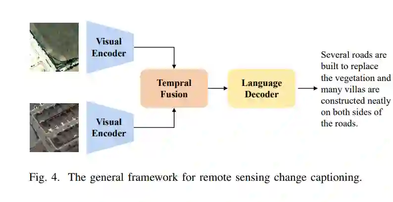 I. 引言遥感技术通过卫星、无人机等各种平台获取地球表面的图像信息【1】–【4】。它在环境监测、城市规划、灾害预警和评估等关键领域中发挥着重要作用【5】–【8】。早期的遥感图像解译主要集中于单时相图像的分析,包括土地覆盖分类【9】、物体检测【11】【12】和语义分割【13】【14】等任务。然而,单时相图像仅反映特定时刻的表面状况,无法捕捉跨时间的动态变化。随着遥感技术和设备的快速进展,获取多时相遥感图像的能力得到了显著提高【15】–【17】。多时相遥感图像提供了不同时间点下某些位置的表面特征信息,为地表变化的动态监测开辟了新途径【18】【19】。这一时序维度至关重要,因为它使研究人员能够分析随时间变化的趋势,从而对环境动态有更全面的了解。早期的时序图像理解主要集中于变化检测技术,通过比较不同时间段的图像来定位变化区域,如植被覆盖变化或新建筑物的出现【20】【21】。然而,变化检测通常仅在视觉层面上检测变化位置,缺乏对变化的更高层次语义理解,如变化对象的类型、变化过程中的状态,以及对象之间的关系【22】–【24】。近年来,像Llava【25】和GPT-4【26】等视觉-语言模型(VLMs)取得了突破性进展,推动了多模态研究领域对视觉-语言模型的关注【27】–【29】。VLMs结合了计算机视觉和自然语言处理技术,能够全面理解视觉和文本信息。与专注于单一图像模态的视觉模型不同,VLMs不仅识别图像中的目标对象,还理解它们之间的关系,生成描述性语言或回答问题。这一能力在遥感领域具有巨大的应用潜力【30】–【32】。在遥感领域,已有研究探讨了各种视觉-语言模型,如图像描述【33】–【36】、视觉问答(VQA)【37】–【40】、视觉问题生成【41】【42】、图像检索【43】–【45】和视觉定位【46】–【48】等。一些近期的研究探索了基于大型语言模型(LLMs)的遥感视觉语言模型,如RSGPT【49】、GeoChat【50】、H2RSVLM【51】、LHRS-Bot【52】和EarthGPT【53】。然而,这些VLMs主要关注单时相遥感图像,无法实现多时相遥感图像的理解。随着VLM的不断发展,针对多时相遥感图像的研究进入了一个新的发展阶段。研究人员越来越多地探索专为时序图像理解设计的遥感时序视觉-语言模型(RS-TVLMs),涉及变化描述【22】【23】和变化视觉问答【54】【55】等任务。RS-TVLMs的研究丰富了时序图像解译的工具。语言作为人类沟通和知识的载体【56】,在融入时序图像分析时能够增强模型的高层次理解。通过将时序视觉信息与语言结合,RS-TVLMs不仅可以识别目标和变化,生成描述性文字,回答相关问题,还能进行多模态交互,从而将时序图像的解译扩展到超越单纯的视觉判断。图1展示了一些具有代表性的RS-TVLM及其发表日期,表明该领域的研究可追溯到2021年。目前,相关研究数量正在迅速增加。尽管RS-TVLMs的研究兴趣日益增长,但系统性的综述仍然较少。现有的许多研究集中于特定任务的孤立方法,这使得研究人员很难全面了解该领域的进展和未来方向。贡献。鉴于RS-TVLMs的快速进展和良好的发展前景,我们撰写了本综述,旨在让研究人员了解基本概念、主要方法、数据集、评估指标及变化描述和变化视觉问答等任务的当前进展。据我们所知,这是关于RS-TVLMs的首篇综述。通过回顾现有研究,我们希望为该领域的研究描绘清晰的路径和未来方向,弥补当前相关综述中的空白,并为遥感时序图像理解的RS-TVLM研究奠定基础。IV. 遥感时序视觉-语言模型目前,遥感时序图像中的视觉-语言理解研究主要集中在几个关键领域:变化描述、变化视觉问答、变化检索和变化定位。这些任务旨在通过多模态建模和语言理解增强遥感时序图像的解译。此外,随着大型语言模型(LLMs)的发展,一些近期的研究探索了将LLMs集成进来,进一步提升遥感时序图像的视觉-语言理解。