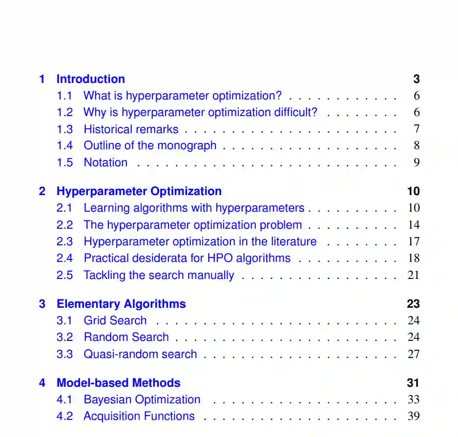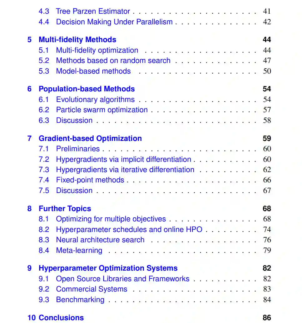 本专著的主题是超参数优化(HPO)。可用的算法工具来自动化这一任务及其广泛采用将有助于机器学习研究人员以一种原则化的方式处理超参数。更重要的是,这些工具将保证新的研究进展可以复现,从而毫无争议地为该领域作出贡献。随着实验设置的发展,我们认为研究人员需要发布所使用的 HPO 算法、允许消耗的资源量(Dodge 等人,2019)以及所考虑的超参数搜索空间(Gundersen 和 Kjensmo,2018)。我们的目标是提供关于 HPO 的既定技术和最新进展的全面概述。通过这样做,我们希望有助于在研究和工业领域系统性地使用自动化 HPO 算法的实践。