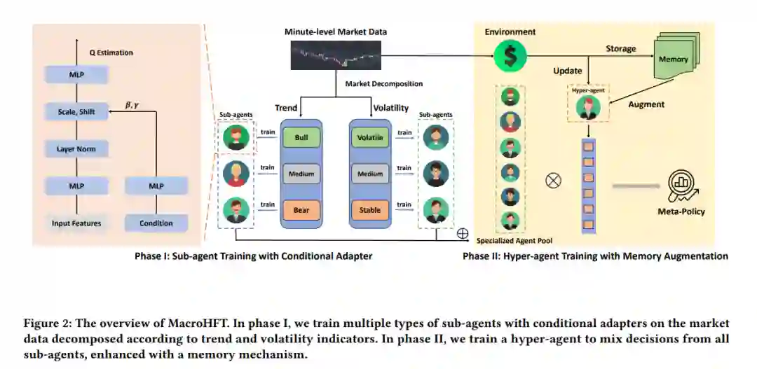 MacroHFT:内存增强的高频交易情境感知强化学习高频交易(HFT)在短时间尺度内执行算法交易,近年来已占据了加密货币市场的大部分份额。除了传统的量化交易方法外,强化学习(RL)由于其处理高维金融数据和解决复杂的序列决策问题的能力,成为HFT的另一种有吸引力的方法。例如,分层强化学习(HRL)通过训练一个路由器从代理池中选择一个子代理来执行当前交易,展示了其在秒级HFT中的出色表现。然而,现有的用于HFT的RL方法仍然存在一些缺陷:1)标准的基于RL的交易代理存在过拟合问题,无法根据金融背景进行有效的策略调整;2)由于市场条件的快速变化,由单个代理做出的投资决策通常是片面的和高度偏颇的,这可能导致在极端市场中产生重大损失。为了解决这些问题,我们提出了一种新颖的内存增强的高频交易情境感知强化学习方法,简称MacroHFT,包括两个训练阶段:1)我们首先根据市场趋势和波动等各种金融指标分解市场数据,训练多种类型的子代理,每个代理都拥有一个条件适配器,以根据市场条件调整其交易策略;2)然后我们训练一个超级代理来混合这些子代理的决策,并输出一个一致盈利的元策略以应对快速的市场波动,并配备内存机制以增强决策能力。对各种加密货币市场的广泛实验表明,MacroHFT可以在分钟级交易任务中实现最先进的性能。代码已在此处发布。