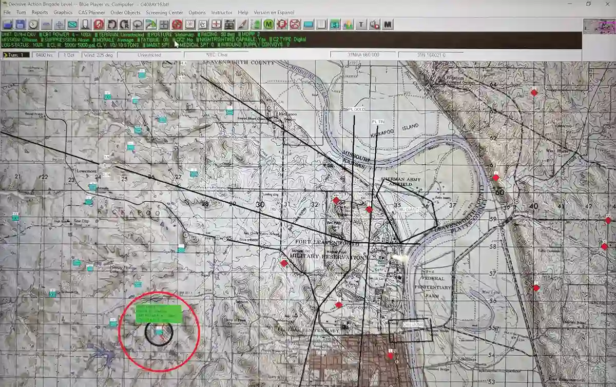 图:在 "决定性行动 "模拟软件第一阶段计算机产品的基础上,学生们继续使用基于地图的 "陆地力量 "模拟软件进行兵棋推演。