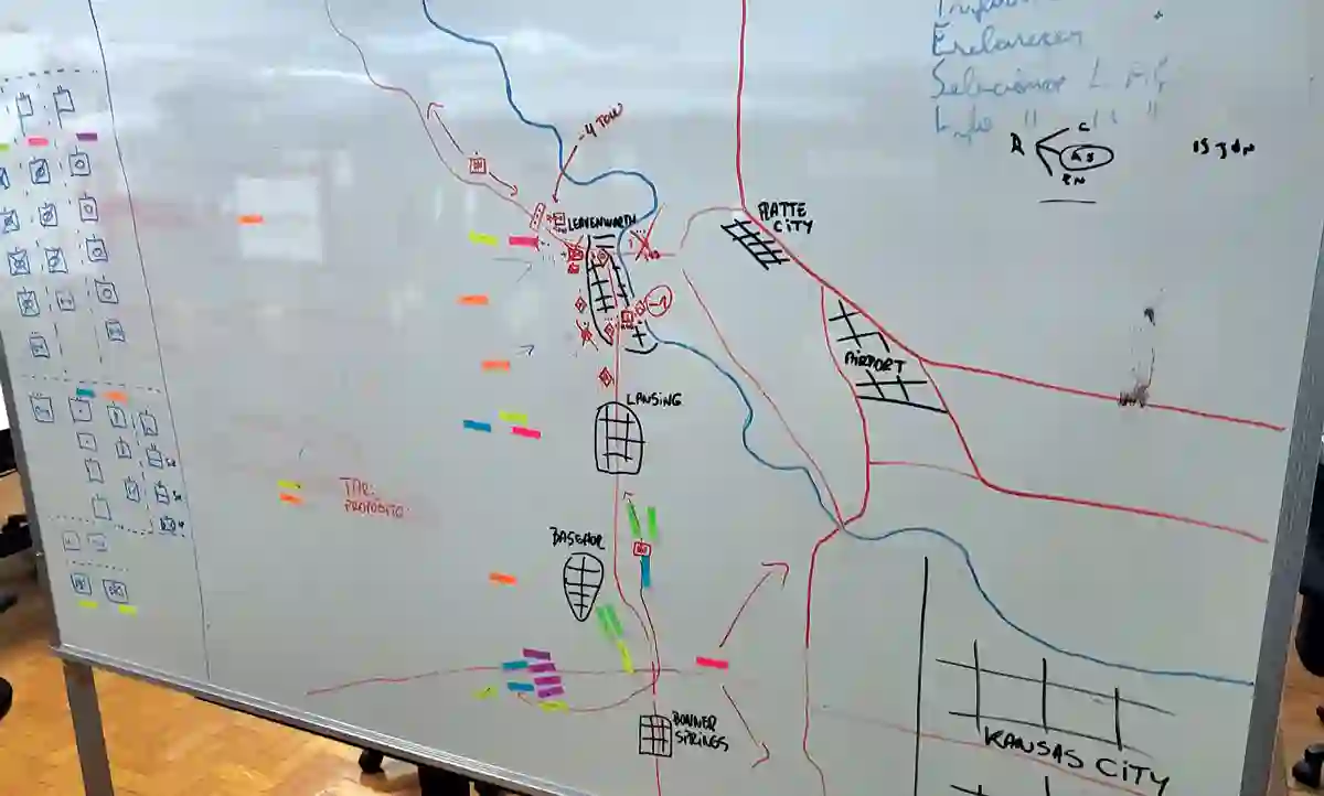图:第二阶段完成后,学生们不得不在没有地图的情况下继续进行第三阶段,转而设计了另一种模拟方法,利用白板完成兵棋推演练习。