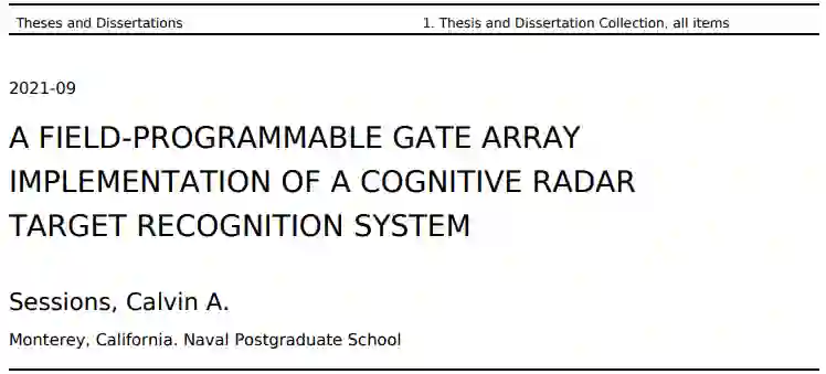 本研究的目的是设计一个用于电子战应用的认知雷达(CRr)目标识别系统的现场可编程门阵列(FPGA)实现。这篇论文对称为加权能量概率(PWE)的闭环自适应匹配波形传输技术进行了扩展。这项工作还研究了在功能性数字硬件实现中应用PWE技术的可行性。最初,在Verilog硬件描述语言中开发了一个PWE蒙特卡洛仿真模型,在Xilinx Vivado环境中进行仿真。然后,在蒙特卡罗模型中开发的Verilog模块组件被整合到利用赛灵思VCU118评估板的CRr目标识别系统实验中。VCU118具有Virtex UltraScale+高性能FPGA,可完成CRr自适应波形生成和传输、数字信号处理要求和目标分类。罗德与施瓦茨公司的SMW200A矢量信号发生器和FSW信号与频谱分析仪分别作为雷达系统的发射器和接收器,而FPGA实现了CRr使用的封闭反馈回路。