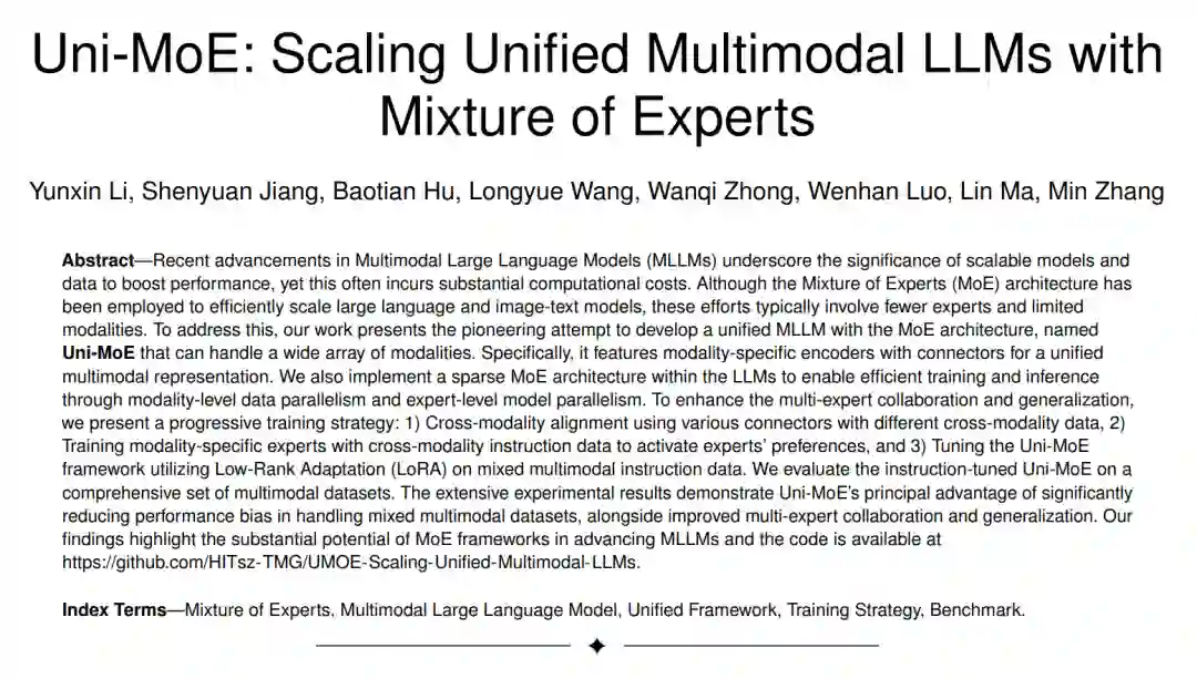 近年来,多模态大语言模型(MLLMs)的进展强调了可扩展模型和数据在提升性能方面的重要性,但这通常会带来巨大的计算成本。尽管专家混合模型(MoE)架构已被用于有效扩展大型语言和图文模型,但这些尝试通常涉及的专家数量较少,且模态有限。为了解决这一问题,我们的工作首次尝试开发一个使用MoE架构的统一MLLM,名为Uni-MoE,该模型可以处理多种模态。具体而言,它具有带有连接器的模态特定编码器,以实现统一的多模态表示。我们还在LLM中实现了稀疏的MoE架构,通过模态级数据并行和专家级模型并行来实现高效的训练和推理。为了增强多专家的协作和泛化能力,我们提出了一种渐进的训练策略:1)使用不同的跨模态数据通过各种连接器进行跨模态对齐,2)使用跨模态指令数据训练模态特定的专家,以激活专家的偏好,3)使用低秩适应(LoRA)在混合多模态指令数据上调整Uni-MoE框架。我们在一套全面的多模态数据集上评估了指令微调的Uni-MoE。广泛的实验结果表明,Uni-MoE在处理混合多模态数据集时显著减少了性能偏差,并改进了多专家协作和泛化能力。我们的研究结果突显了MoE框架在推进MLLMs方面的巨大潜力,代码可在https://github.com/HITsz-TMG/UMOE-Scaling-Unified-Multimodal-LLMs上获取。
