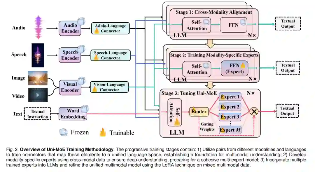 由于在向GPT-4V和Gemini扩展多模态大型模型时带来的高昂训练和推理成本,以及MoE结构的高效性,我们在此探索利用MoE架构实现一个高效且强大的统一MLLM。图2展示了设计的Uni-MoE的示意图,展示了其全面的设计,包括音频、语音和视觉的编码器,以及相应的模态连接器。这些连接器用于将各种模态输入转换为统一的语言空间。然后,我们在核心LLM块中集成了MoE架构,这对于提高训练和推理过程的效率至关重要,因为它只激活部分参数。这是通过实施一个稀疏路由机制来实现的,如图2底部所示。整个Uni-MoE的训练过程分为三个不同的阶段:跨模态对齐、训练模态特定的专家和使用多样化的多模态指令数据集微调Uni-MoE。在接下来的小节中,我们将详细探讨Uni-MoE的复杂架构和渐进的训练方法。