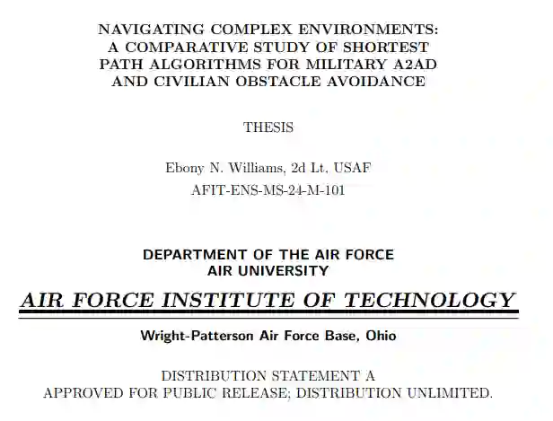 本文通过双重聚焦研究,深入探讨最短路径算法在军事与民用领域的实际应用。通过构建两篇独立文章,本研究旨在建立统一框架以应对各领域特有挑战。通过剖析军事反介入/区域拒止(A2AD)环境与障碍密集的民用场景中路径规划的复杂性,研究致力于为多场景适应性解决方案奠定理论基础。首篇论文(第二章)聚焦民用领域,重点研究障碍密集环境下的导航问题;次篇论文(第三章)则着力解决军事环境中遭遇的复杂挑战。