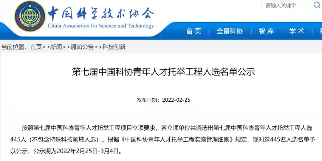 2月25日,中国科学技术协会发布了《第七届中国科协青年人才托举工程人选名单公示》。按照第七届中国科协青年人才托举工程项目立项要求,各立项单位共遴选出第七届中国科协青年人才托举工程人选445人(不包含特殊科技领域人选)。
