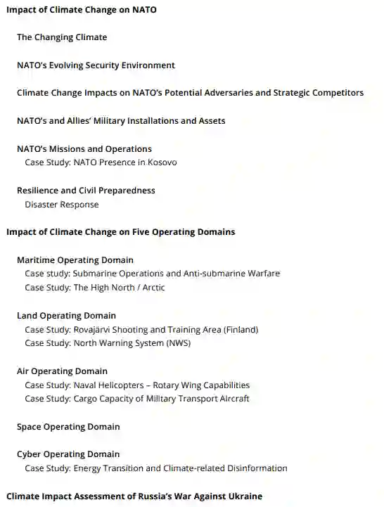 气候变化是当今时代的决定性挑战,对国防安全产生深远影响。2021年布鲁塞尔峰会上,北约成员国元首与政府首脑(HOSG)批准了《气候变化与安全行动计划》,并一致认同应成为理解并适应气候变化对安全影响的领军组织。本版《气候变化与安全影响评估》(CCSIA)系第三版,旨在提升北约对气候变化安全影响的认识。报告在2023年版关键结论基础上,详述各类气候相关风险对北约战略环境、军事资产与设施、任务行动、及北约韧性能力与民事备战的影响。报告包含三项地域案例分析:气候变化对北约科索沃驻军、芬兰罗瓦涅米靶训区、以及北美防务合作项目"北方预警系统"(加美联合预警雷达体系)的影响。此外,报告评估潜艇、海军直升机与军用运输机在气候变局中的性能变化,研判气候变化对北约潜在对手与战略竞争者的影响,并剖析俄罗斯对乌战争的气候安全效应。报告整合北约体系多部门成果,包括北约军事当局(NMAs)、北约科技组织海洋研究与实验中心(STO CMRE)以及北约认证的气候变化与安全卓越中心(CCASCOE)。本评估可为联盟制定近、中、长期气候应对决策提供前瞻依据,同时提升北约适应能力。