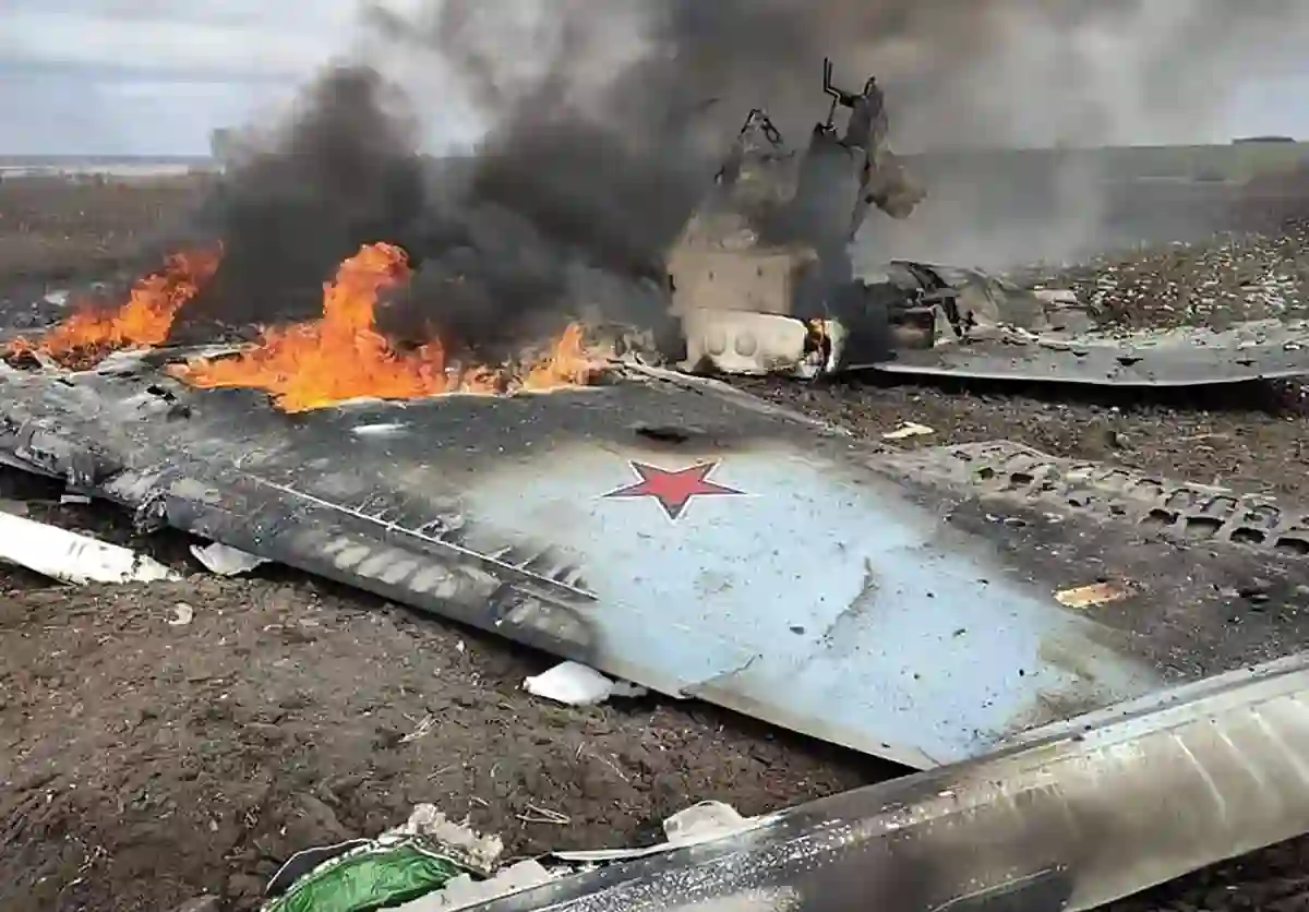 图:约 2022 年 4 月 3 日,被乌克兰空军击落的俄罗斯苏-35 战斗机残骸在哈尔科夫地区的地面上燃烧。(图片由乌克兰国防部提供)
