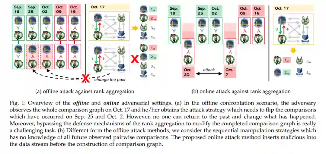 成对比较的排名聚合广泛应用于社会学、政治学、经济学、心理学、体育等领域。鉴于其巨大的社会影响和随之而来的激励措施,潜在的对手有强烈的动机来操纵排名列表。然而,理想的攻击机会和过度的对抗能力使现有方法难以实际操作。为了充分探索潜在的风险,我们利用了在线攻击脆弱的数据收集过程。由于它独立于排名聚合并且缺乏有效的保护机制,我们通过伪造成对比较来干扰数据收集过程,而无需了解未来的数据或真实分布。从博弈论的角度来看,在线操纵者与控制原始数据源的排名者之间的对抗场景被表述为应对知识不确定性的分布鲁棒博弈。然后我们通过分析Bernoulli和水库等采样算法的脆弱性,证明了在上述博弈中,均衡可能对对手有利。根据上述理论分析,我们在贝叶斯决策框架和一大类参数成对比较模型下提出了不同的序列操作策略。对于完全掌握知识的攻击者,我们建立了所提出策略的渐近最优性。为了提高在不完全知识下进行序列操作的成功率,一个分布鲁棒估计器替代了鞍点问题中的最大似然估计,提供了一个保守的数据生成解决方案。最后,验证性的实证结果表明,所提出的方法能够以序列方式操纵排名聚合方法的结果。