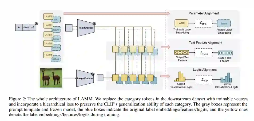 随着CLIP等预训练视觉-语言(VL)模型在视觉表示任务中的成功,将预训练模型迁移到下游任务已成为一个关键范式。最近,源自自然语言处理(NLP)的提示调整范式在VL领域取得了显著进展。然而,早期方法主要集中于为文本和视觉输入构建提示模板,忽略了VL模型与下游任务之间类别标签表示的差距。为了应对这一挑战,我们引入了一种名为LAMM的创新标签对齐方法,可以通过端到端训练动态调整下游数据集的类别嵌入。此外,为了实现更合适的标签分布,我们提出了一个分层损失,包括参数空间、特征空间和逻辑空间的对齐。我们在11个下游视觉数据集上进行了实验,并证明了我们的方法显著提高了现有多模态提示学习模型在小样本场景中的性能,与最先进方法相比,在16次射击上平均准确率提高了2.31(%)。此外,我们的方法在持续学习方面与其他提示调整方法相比显示出了优势。重要的是,我们的方法与现有的提示调整方法是协同的,并可以在它们的基础上提高性能。我们的代码和数据集将在https://github.com/gaojingsheng/LAMM上公开。
