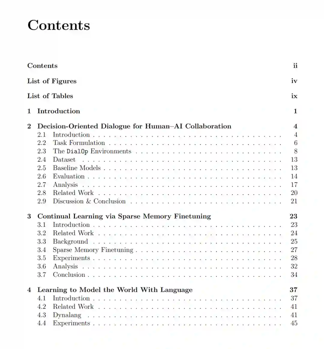我通过三个互补的视角来应对这一挑战:评估、架构以及学习目标。 * 首先,我提出了 DialOp,这是一个用于评估语言模型智能体与人类如何共同做出复杂日常决策的基准测试,为衡量系统的协同能力提供了严谨的框架。 * 其次,我证明了通过为语言模型架构增加记忆层(Memory Layers),可以实现高效的知识更新,从而为跨交互过程中的持续学习(Continual Learning)奠定了基础。 * 最后,我将这些理念从文本领域扩展到了具身多模态智能体(Embodied, Multimodal Agents)。研究表明,将语言学习与**世界建模目标(World Modeling Objectives)**相结合,能够使智能体理解多样化的人类交流形式(包括人类反馈)。