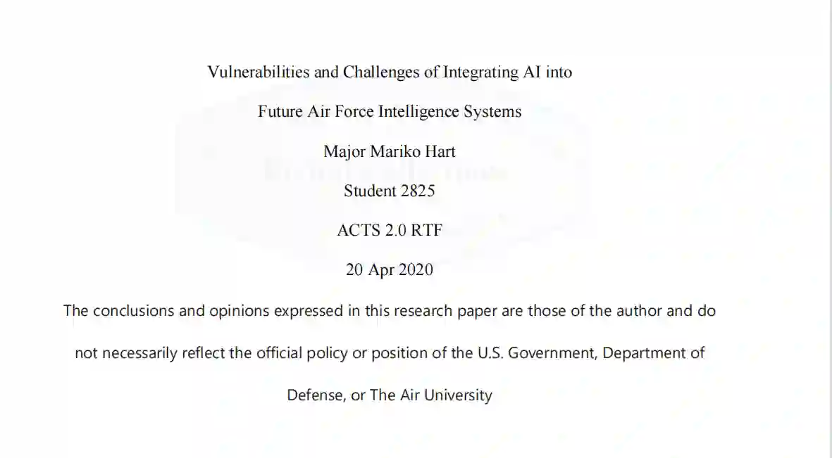 美国防部和空军对人工智能在情报中的应用所进行的研究投资,对于确定部队应如何准备与传感网格进行人机合作是至关重要的。对领导人和一线分析人员进行培训,让他们了解在自动化、人工智能支持的SIAS中存在的道德难题和对手攻击的可能性,这对保护组织不传播错误信息至关重要。幸运的是,美国防部和空军ISR领导人主张在传感网格系统中采用以人为本的设计和培训模式还为时不晚,因为AFRL的工程师们正在继续努力为部队提供一个安全、务实的解决方案。领导人必须认识到以速度换取精确性的组织倾向,并理解精心设计的系统分阶段整合将是值得等待的。