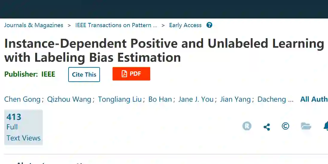 现实生活中,许多情况下由于负类样本的获取比较困难或负类样本太过多样,因此模型训练时只有正样本和大量的未标注样本。为处理这种情况,PU学习(Positive and Unlabeled Learning,简称PU learning)被提出,以处理只有正类和未标注数据情况下的分类器训练问题。本文研究了实例相关的PU分类,具体是指其中一个正样本是否会被标注(由 s 表示)不仅与类别标签 y 相关,还取决于特征向量x 。换而言之,正样本被标注的概率并不满足以前工作的假设——即所有正样本以相同概率被均匀标注。因此,本文提出了标注偏差估计的方法来处理这种实例相关的PU学习问题。目前,该文已发表于人工智能国际顶级期刊《IEEE Transactions on Pattern Analysis and Machine Intelligence》。