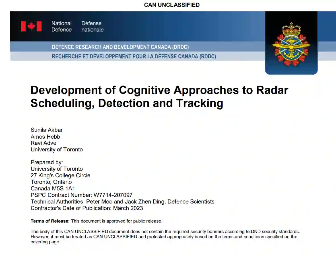 认知雷达能持续感知环境、与环境互动并从中学习。这种范例可应用于多功能雷达(MFR),后者可执行多种功能,如监视、跟踪和通信等。为了执行这些任务,雷达资源管理(RRM)模块将可用资源分配给这些功能,同时考虑任务参数,包括优先级。本报告介绍的工作重点是时间窗口内的任务调度问题。对于时间资源而言,RRM 尤其具有挑战性,因为 1) 任务要求可能极为不同,具有多个优先级类别;2) 调度策略应能适应动态环境。适应非稳态环境是认知雷达的一个关键优势。