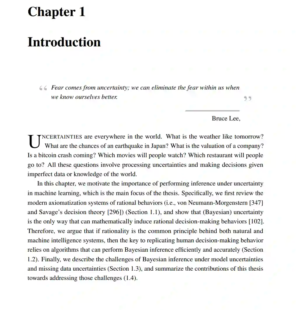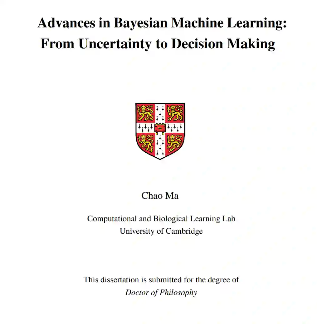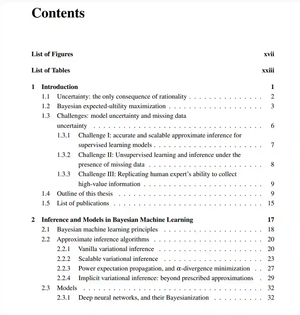 贝叶斯不确定性的量化是许多机器学习应用的关键元素。为此,开发了近似推理算法[176],以相对较低的成本执行推理。尽管最近将近似推理扩展到"大模型×大数据"机制取得了进展,但仍存在许多公开挑战。例如,如何正确地量化复杂、不可识别的模型(如神经网络)的参数不确定性?如何正确处理由缺失数据引起的不确定性,并以可扩展的方式进行学习/推理?此外,如何优化地收集新信息,使缺失数据的不确定性进一步减少,从而做出更好的决策?本文对这些研究问题提出了新的研究方向和新的技术贡献。本文分为两个部分(主题A和主题B)。在主题A中,我们考虑在监督学习设置下量化模型的不确定性。为了克服参数空间推理的一些困难,本文提出了一个新的研究方向,称为函数空间近似推理。也就是说,通过将监督概率模型视为随机过程(对函数的度量),我们现在可以通过另一类(更简单的)随机过程来近似预测函数的真实后验。为函数空间推理提供了两种不同的方法,并证明它们返回更好的不确定性估计,以及在复杂模型上改进的经验性能。在主题B中,我们考虑了无监督学习环境下缺失数据不确定性的量化。本文提出一种基于深度生成模型的缺失数据不确定性量化新方法。它允许我们摆脱传统方法的计算负担,并执行准确和可扩展的缺失数据填补。此外,利用生成模型返回的不确定性估计,提出了一个信息论框架,用于高效、可扩展和个性化的主动信息获取。这使我们能够最大限度地减少缺失数据的不确定性,并根据新信息做出改进的决策。