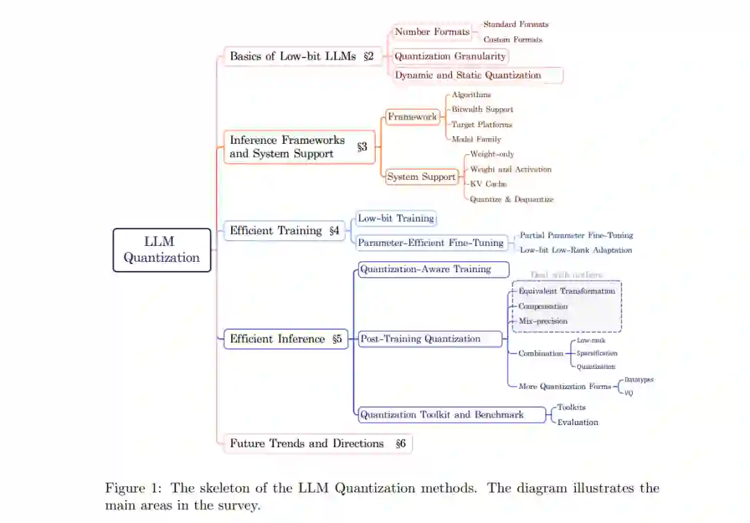 在本综述中,我们对大语言模型(LLM)的低比特量化技术进行了深入探讨,重点强调了其在解决这些模型在受限环境中部署时所面临的计算和内存挑战中的重要性。我们首先阐明了低比特量化的基本原理,包括专门针对 LLM 的新型数据格式和量化粒度。我们对系统和框架的回顾展示了支持低比特 LLM 在不同硬件平台上运行的多种方法和工具。我们还对各种用于优化训练和推理的技术进行了分类和讨论,提供了对当前方法的全面理解。最后,我们探讨了该领域的未来方向和新兴趋势,强调了可能的研究领域和技术进步,这些将进一步提升 LLM 量化的效率和效果。随着 LLM 研究领域的不断演变,本综述旨在为推动低比特量化技术的发展提供有价值的参考资源。