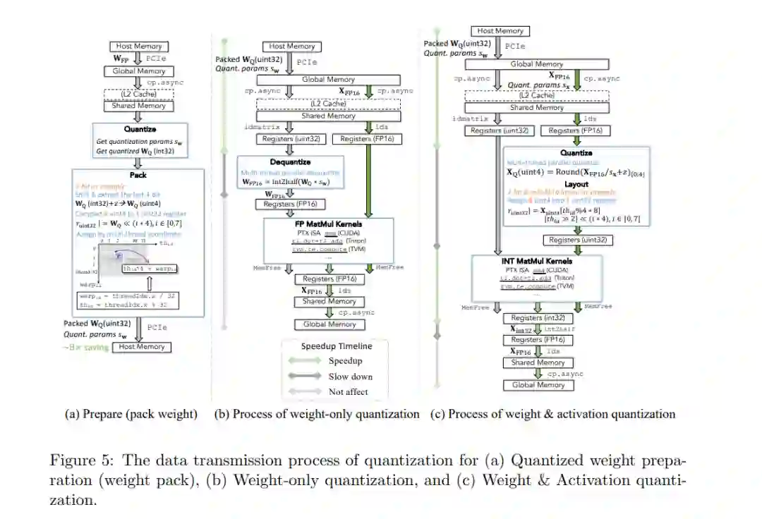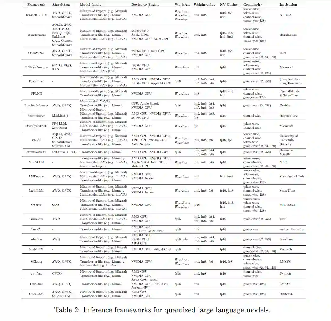 自大语言模型(LLM)问世以来的短短几年间,已经涌现出许多支持 LLM 易用性的框架。我们在本节中选取了一些与量化相关的知名代表性框架和工具,按照以下类别进行总结和介绍:(1) 量化推理框架,它提供了全面的库和 API,以便快速开发和部署 LLM 应用;(2) 量化的系统支持,支持量化方法的底层核心功能。接下来,我们将重点讨论各种框架和库中 LLM 的量化支持。