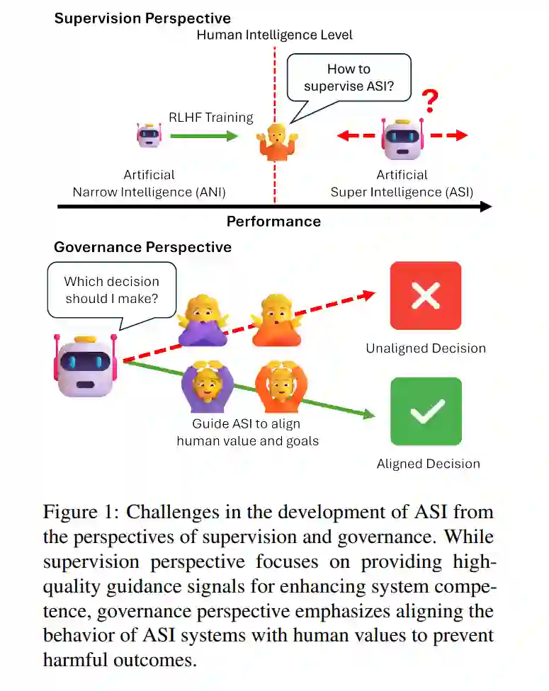 大语言模型(LLMs)的出现激发了关于**人工超智能(ASI)**的可能性,这是一种超越人类智能的假设性AI系统。然而,现有的对齐范式难以引导如此先进的AI系统。超级对齐是指将AI系统与人类价值观和安全要求在超人类能力水平上的对齐,旨在解决两个主要目标——监督的可扩展性,以提供高质量的指导信号,以及稳健的治理,确保与人类价值观的对齐。