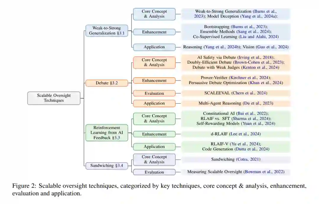 主要的挑战在于监督信号 SSS 的可扩展性。随着 AANI\text{AANI}AANI 接近或超越人类水平的能力,监督信号集 SSS 必须不断增加质量。 关键思想 可扩展监督是一种通过为超越人类智能的AI系统提供高质量监督信号来实现超级对齐的方法。它关注于评估和引导AI系统,而超级对齐则是确保AI系统始终与人类的价值观和目标对齐的最终目标。2.3.2 方法 可扩展监督已成为应对治理ASI挑战的有前景的解决方案。它使得高效地对齐具有复杂目标的AI系统成为可能,而这些目标通常过于昂贵或难以频繁评估。已有多种可扩展监督技术被提出,包括迭代蒸馏与扩展(IDA)(Christiano et al., 2018; Charbel-Raphaël, 2023)、递归奖励建模(RRM)(Leike et al., 2018)和合作逆向强化学习(Hadfield-Menell et al., 2016)。这些方法为当前的可扩展监督方法奠定了基础,如弱到强泛化、辩论、来自AI反馈的强化学习(RLAIF)和夹击(sandwiching)(Burns et al., 2023; Irving et al., 2018; Bai et al., 2022; Bowman et al., 2022)。图2展示了当前的可扩展监督技术及其方法论。 * ****弱到强泛化(W2SG)****是基于IDA(Christiano et al., 2018; Charbel-Raphaël, 2023)和RRM(Leike et al., 2018)的思想的实证研究。W2SG探索了在弱AI系统标签下训练的强AI系统是否能够超越精细调优后的弱AI系统的能力(Burns et al., 2023)。