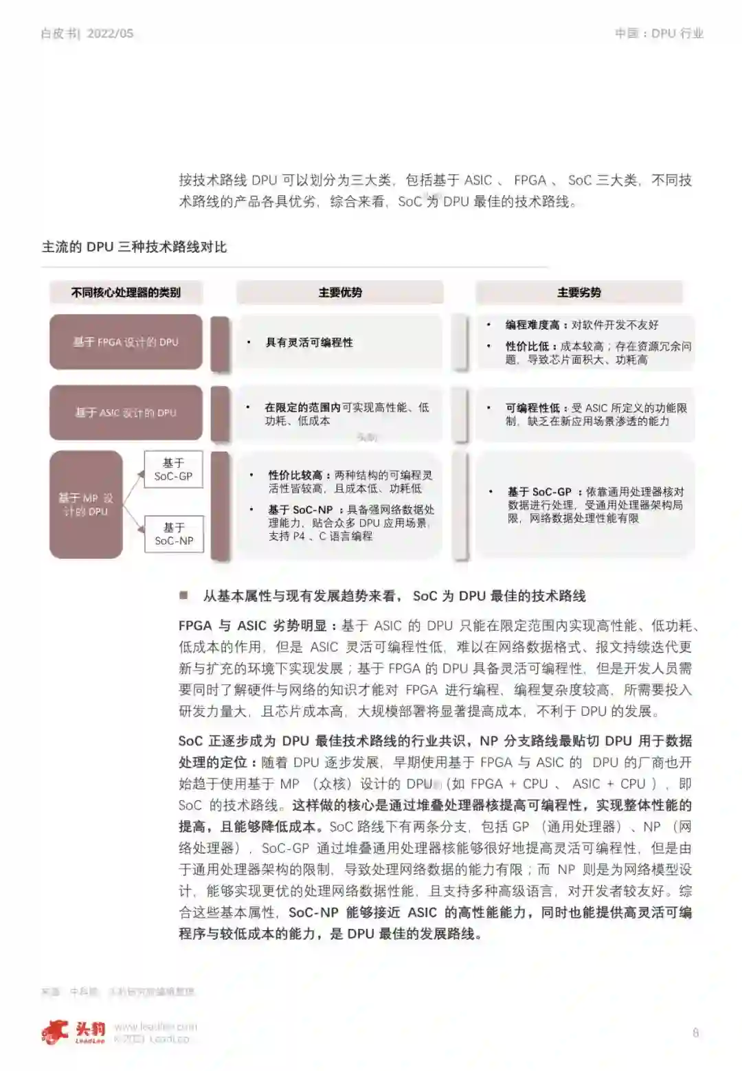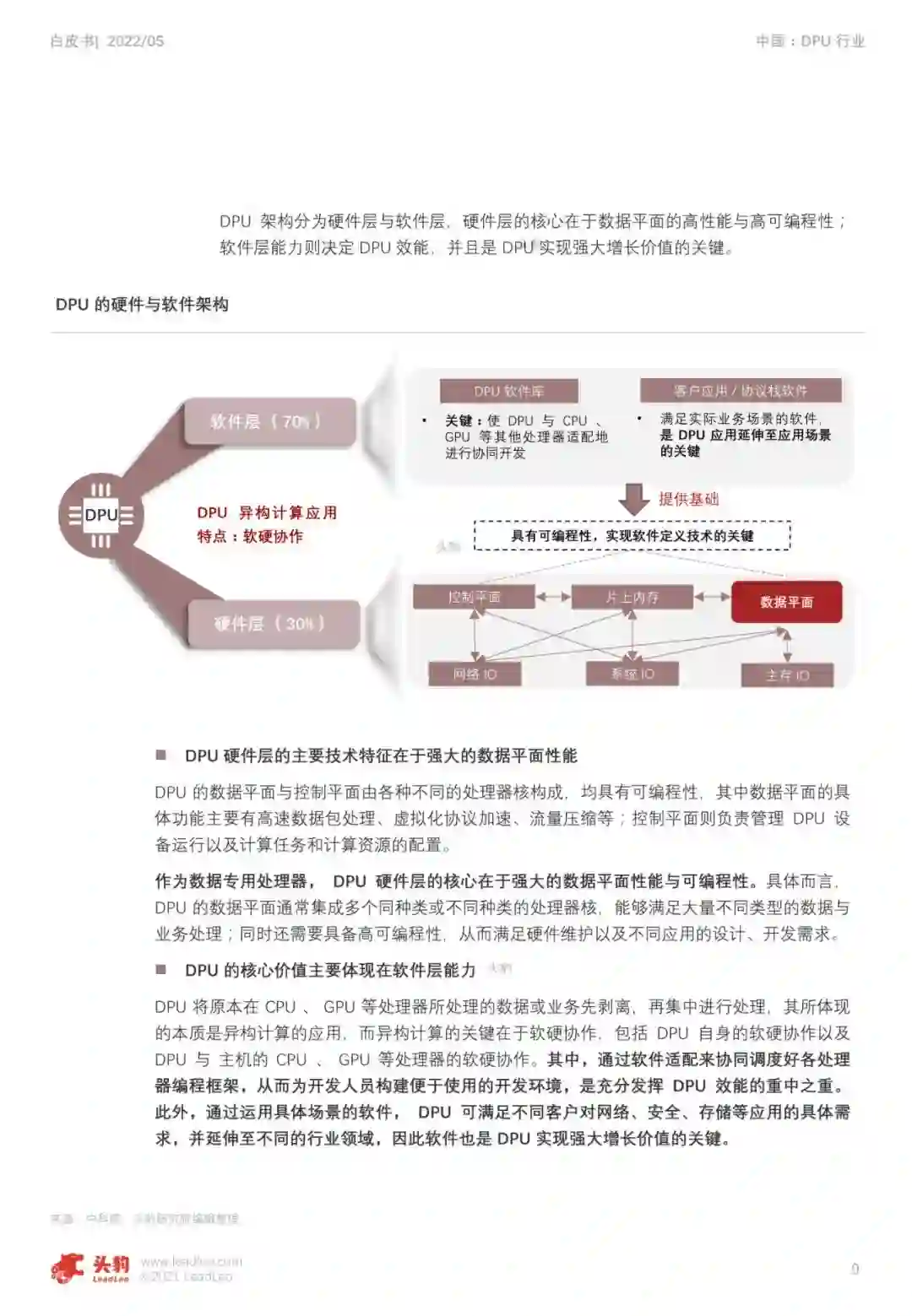 头豹研究院谨此发布《2022年中国DPU行业白皮书》。本报告旨在分析DPU发展现状、产品特点、技术动向及发展趋势,并识别中国芯片厂商与海外芯片厂商的差异,从而判断中国DPU行业的现状与发展机遇。基于全文的论述,本报告在最后分享了作者对于行业未来发展理解与思考,旨在倡导行业内外各方加强合作,从而推动中国DPU行业与中国芯片行业整体发展。