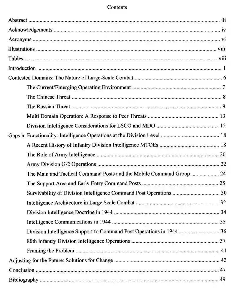 第二节研究师级的情报行动。本节回顾了第二次世界大战(WWII)期间的一次师级情报行动,这是美国陆军部队最后一次在没有使用卫星来促进通信和情报收集的情况下进行LSCO。特别是第80步兵师在1944年和1945年在乔治-巴顿将军的美国第三军中横跨法国北部作战时的情报使用情况。这项研究确定了在情报部门组织和信息传播方面的经验教训和最佳做法。此外,本专著还讨论了一个师的情报部门最近的MTOE历史,这些变化如何影响该部门支持LSCO的能力。